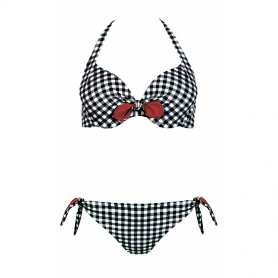 Wyróznia się pięknym wzorem w pepitkę z bordowymi elementami, miękki biustonosz z pianką na fiszbinach, wyjmowane wkładki push-up, wiązany na szyi. Z tyłu zapinany na haczyk, figi wiązane po bokach, dwustronne majtki.